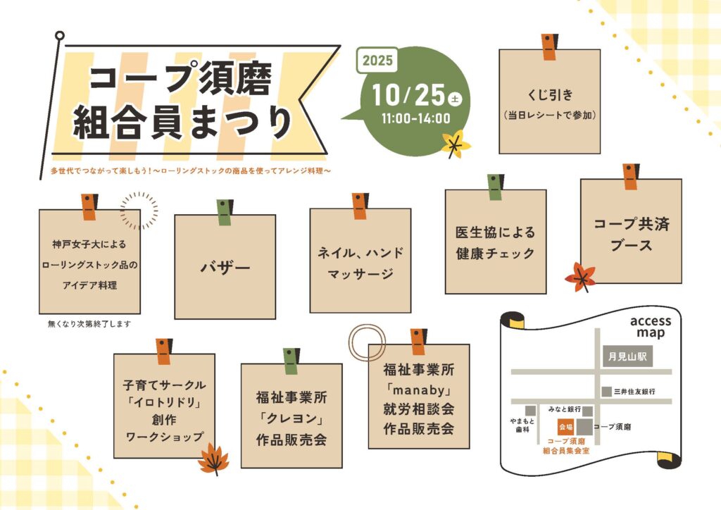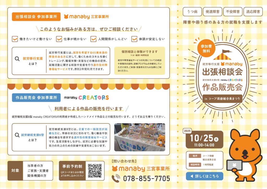 manaby三宮事業所は、2025年10月25日(土)にコープ須磨店 にて開催される「コープ須磨組合員まつり」に出展し、就労相談会を開催します。