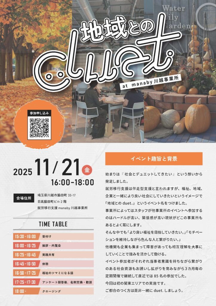 2025年12月にオープン予定の就労移行支援 manaby 川越事業所にて、地域福祉機関の皆さまと情報交換を行う「ダイアローグイベント 社会とのduet.」を開催いたします。