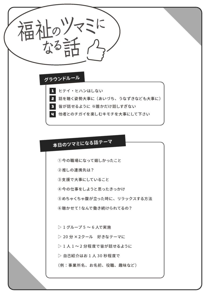 法人や事業所の垣根を越えて、多様な経験や立場の方々がつながり、日々の支援に役立つ情報を交換できる場を目指しています。どうぞお気軽にご参加ください。