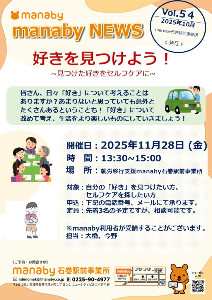 就労移行支援 manaby石巻駅前事業所は、2025年11月28日にセルフケアについて考えるレクリエーション「好きを見つけよう!」を開催します。
